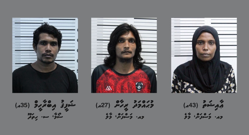 އެ މައްސަލައާ ގުޅިގެން ފުލުހުން ވަނީ ތިން މީހަކު ހައްޔަރުކޮށްފަ އެވެ. އެއީ އެ މީހާ ރަހީނުކުރި ގެ، މއ. މަސްފަން/ އާއިޝަތު (43އ) އާއި އޭނާގެ ދަރިފުޅު މުހައްމަދު ރީހާން (27އ) އަދި ސ. ހިތަދޫ/ ސޯމާ، ޝަގީގު އިބްރާހިމް (35އ) އެވެ. މި ތިން މީހުންވެސް މިހާތަނަށް ތިބީ ޝަރީއަތް ނިމެންދެން ބަންދުކޮށްފައެވެ.