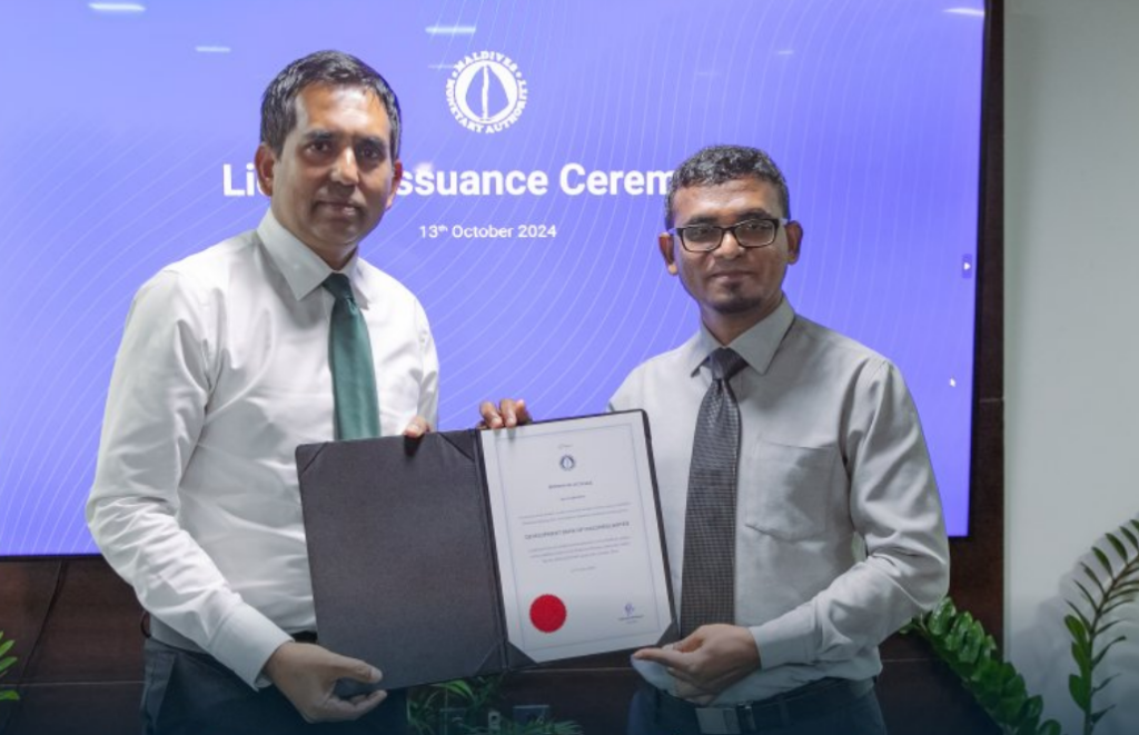 މޯލްޑިވްސް ޑިވެލޮޕްމެންޓް ބޭންކު ހުޅުވަން ބޭނުންވާ ލައިސަންސް، މޯލްޑިވްސް މަނިޓަރީ އޮތޯރިޓީ (އެމްއެމްއޭ)އިން ދޫކޮށްފި އެވެ.
