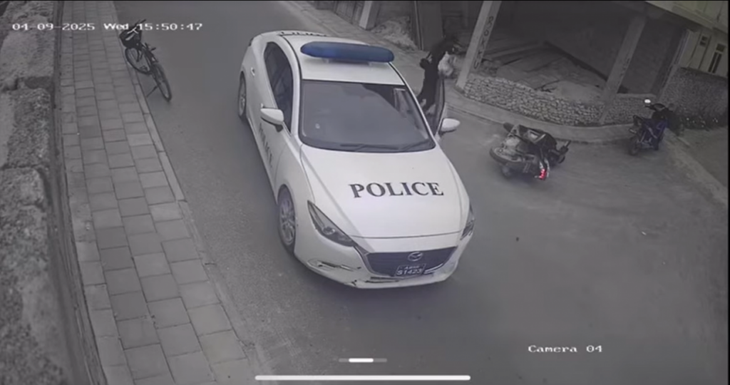 ވެއްޓުމާއެކު ވަގުތުން އަންހެން މީހާ ތެދުވެ ތުއްތު ކުއްޖާ ބިންމަތިން ނަގައި މަގުގެ އެއްކައިރިއަށް ޖެހޭތަން ވީޑިއޯ އިން ފެންނައިރު، ކާރުގައި ތިބި ދެ ފުލުހުން ވެސް ކާރުން ފައިބާ އަންހެން މީހާގެ ގާތަށް ދާ މަންޒަރު ފެނެ އެވެ.