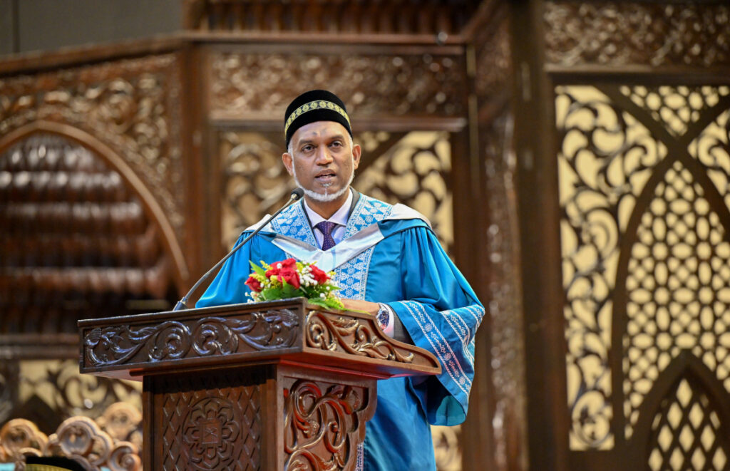 އިންޓަނޭޝަނަލް އިސްލާމިކް ޔުނިވާސިޓީ އޮފް މެލޭޝިއާ (އައިޔޫއެމް)އިން ރައީސަށް އޮނަރަރީ ޑޮކްރަރޭޓެއް އެރުވުމަށްފަހު ދެއްވި ތަގުރީރުގައު ރައީސް ވަނީ އިސްލާމީ ހަލާރަތާއި އިލްމާއި ސައިންސާއި ޒަމާނީ ތަރައްގީގެ އެތައް ވާހަކައަކަށް އަލިއަޅުއްވާލައިފަ އެވެ. އެ ހުރިހާ ކަމަކުން އިބުރަތް ލިބިގަނެ އިސްލީމީ އުންމަތް އެކަތިގަނޑަކަށް ވުމަށް އެ މަނިކުފާނު ގޮވާލެއްވި އެވެ.