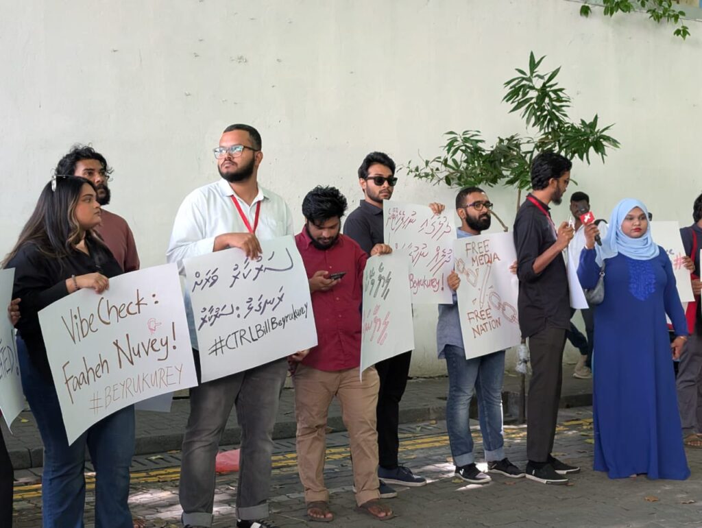 މީޑިއާތަކާއި ނޫސްވެރިން ރެގިއުލޭޓްކުރުމުގެ ނަމުގައި، ސަރުކާރުގެ ނުފޫޒު ފޯރުވޭ ގޮތަށް އަދި ނޫސްވެރިން ބޮޑެތި އަދަދުން ޖޫރިމަނާކުރެވޭ ގޮތަށް ހުށަހަޅާފައިވާ ”މީޑިއާ ކޮންޓްރޯލް“ ބިލާ ދެކޮޅަށް ނޫސްވެރިން މުޒާހަރާ ކުރަމުން ދަނިކޮށް އެ ބިލު ރައްޔިތުންގެ މަޖިލީހުގެ ތަޅުމަށް ބަލައިގަތުމަށް ފާސްކޮށްފި އެވެ.