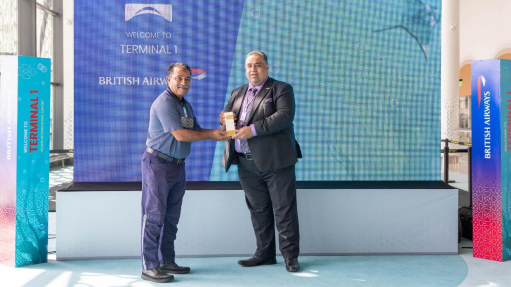 މިއަދުގެ ރަސްމިއްޔާތުގައި ބްރިޓިޝް އެއާވޭސްގެ ޗެކިން ކައުންޓަރުތައް ރަސްމީކޮށް ހުޅުވައި, އެ ފްލައިޓުން ދަތުރުކުރި 126 ފަސިންޖަރުންނަށް ވަނީ ހަދިޔާ ދީފަ އެވެ. އަދި ޓާމިނަލް 1 އަށް ކައިރި ކުރި ބްރިޓިޝް އެއާވޭސްގެ ފުރަތަމަ މަތިންދާބޯޓް BA061 އިން ރާއްޖެ އައި 122 ފަސިންޖަރުންނަށް ވަނީ ސަގާފީ ހަރަކާތްތަކާއެކު ހޫނު މަރުހަބާއެއް ކިޔައިފަ އެވެ.