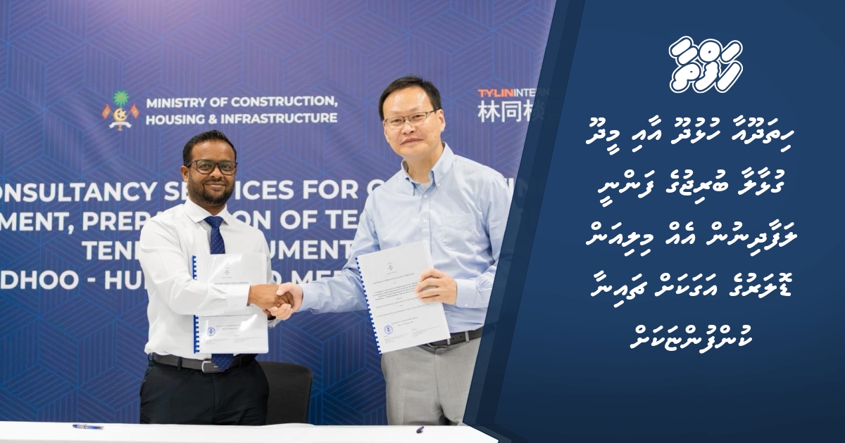 ޗައިނާގެ ޓީވައިލިން އިންޓަނޭޝަނަލް އިންޖިނިއަރިން ކޮންސަލްޓިން ކޮމްޕެނީ ލިމިޓެޑް (ޓީވައިލިން) އާ އެ މަސައްކަތް ހަވާލުކުރުމަށް ކޮންސްޓްރަކްޝަން މިނިސްޓްރީގެ ފަރާތުން އެއްބަސްވުމުގައި ސޮއިކުރެއްވީ މިނިސްޓަރު ޑރ. އަބްދުﷲ މުއްތަލިބެވެ. އަދި ޓީވައިލިންގެ ފަރާތުން ސޮއިކުރެއްވީ އެ ކުންފުނީގެ ޗައިނާ ބްރާންޗްގެ ޕްރެސިޑެންޓް ޗެން ޝީއޯހޫއެވެ.