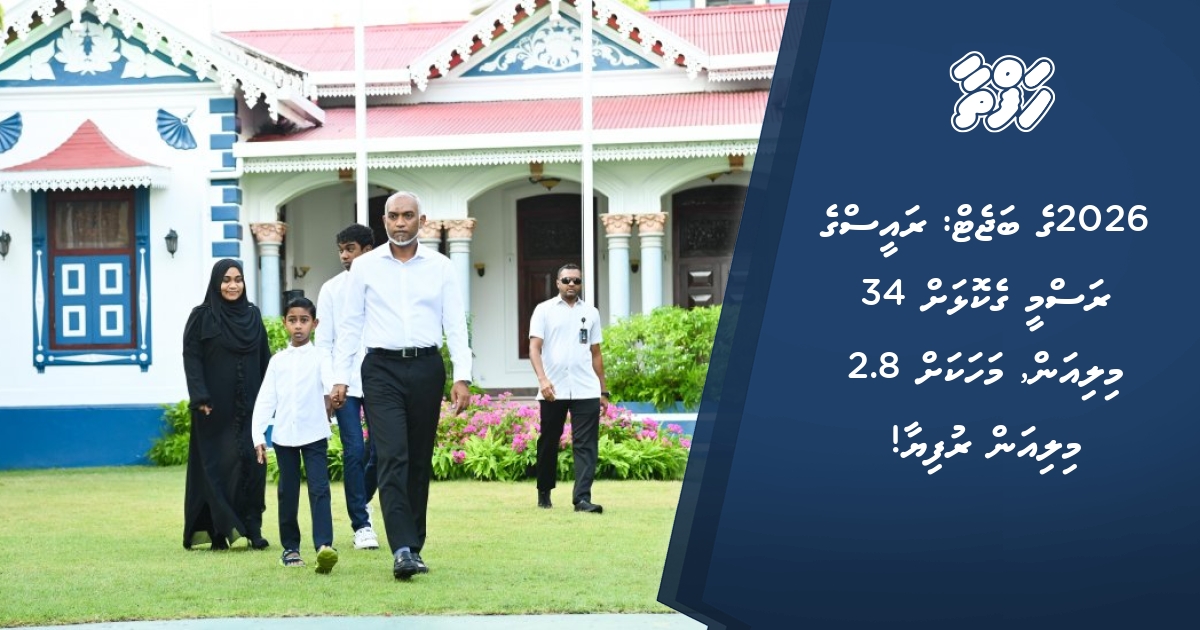 ފިނޭންސް މިނިސްޓްރީގެ ވެބްސައިޓުގައި އާންމުކޮށްފައިވާ 2026 ވަނަ އަހަރުގެ ދައުލަތުގެ ބަޖެޓުގެ ތަފުސީލުގައިވާ ގޮތުން ރައީސް އޮފީހަށް އަންނަ އަހަރު ކަނޑައަޅާފައިވަނީ 240 މިލިއަން ރުފިޔާ އެވެ. އެއީ މި އަހަރަށް ފާސްކުރި ބަޖެޓަށްވުރެ 34 މިލިއަން ރުފިޔާ އިތުރު އަދަދެކެވެ. މި އަހަރުގެ ބަޖެޓުގައި ރައީސް އޮފީހަށް ދީފައިވަނީ 206 މިލިއަން ރުފިޔާ އެވެ.