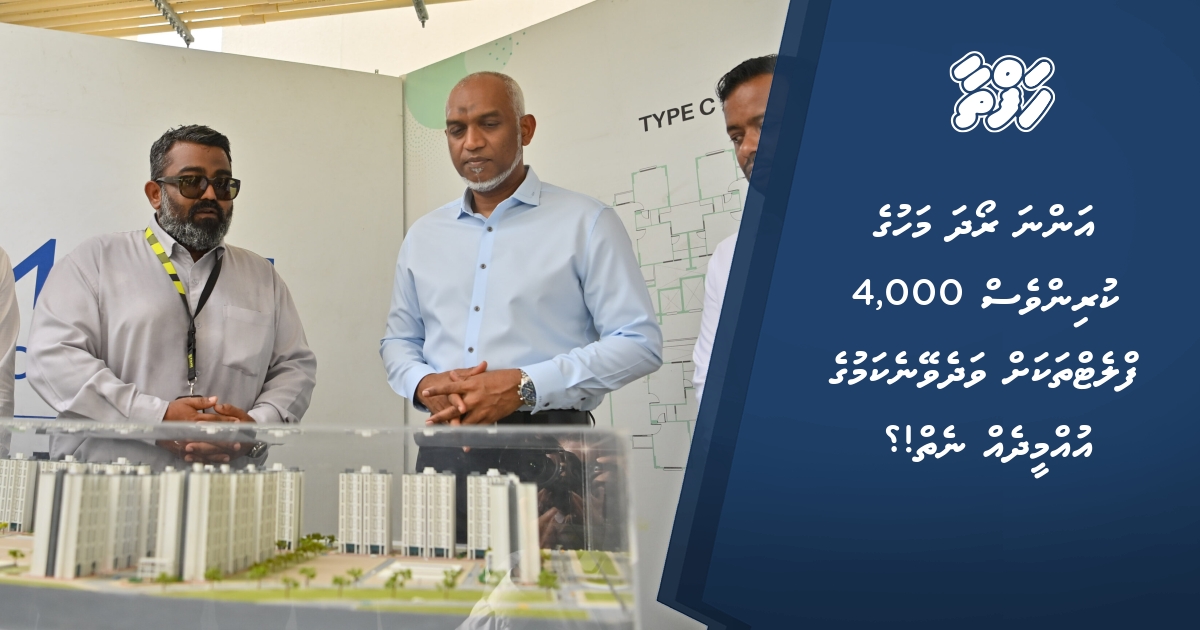 ކުރީގެ ރައީސް އިބްރާހިމް މުހައްމަދު ސޯލިހުގެ ސަރުކާރުން މާލޭގެ ރައްޔިތުންނަށް ފްލެޓް ދޭން ހިންގި ގެދޮރުވެރިޔާ ސްކީމުގެ ދަށުން ހުޅުމާލެ ދެވަނަ ފިޔަވަހީގައި ހަދާފައިވާ 4,000 ފްލެޓް, އަންނަ ރޯދަ މަހަށް ނިންމޭތޯ މަސައްކަތް ކުރައްވާނެ ކަމަށް ރައީސް ޑރ. މުހައްމަދު މުއިއްޒު ވިދާޅުވެއްޖެ އެވެ.