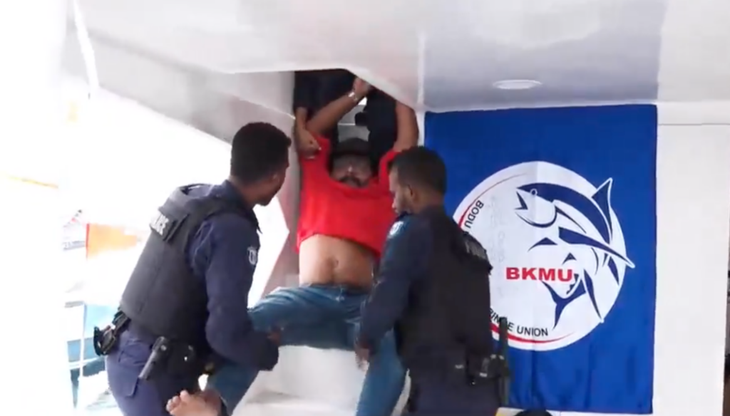 އެ ދެ މީހުން ހައްޔަރުކުރީ މަސްވެރިންގެ މުޒާހަރާ ލީޑުކުރާ ދޯނީގައި އެ މީހުން ތިއްބައި އެ ދޯންޏަށް ފުލުހުންގެ ފައުޖެއް އަރަ އެވެ.