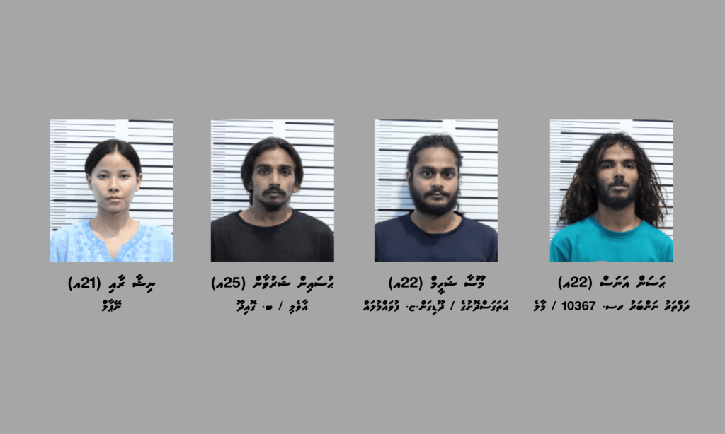 މި މައްސަލާގައި ހައްޔަރުކޮށްފައިވަނީ ދަފްތަރު ނަންބަރު ރސ. 10367/ މާލެ، ހަސަން އަނަސް (22އ) އާއި އަތަގަސްދޮށުގެ/ ދޫޑިގަން. ޏ. ފުވައްމުލައް، މޫސާ ޝަހީމް (22އ) އާއި އާވެލި/ ބ. ގޮއިދޫ، ހުސައިން ޝަރުވާން (25އ) އަދި ނޭޕާލް ރައްޔިތެއް ކަމަށްވާ ނިޝާ ރާއި (21އ) އެވެ.