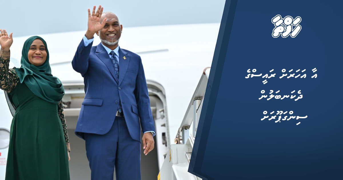 ރައީސް ޑރ. މުހައްމަދު މުއިއްޒާއި އެ މަނިކުފާނުގެ އަނބިކަނބަލުން ސާޖިދާ މުހައްމަދު ނުރަސްމީ ދަތުރުފުޅެއްގައި ސިންގަޕޫރަށް ފުރާވަޑައިގެންފިއެވެ.