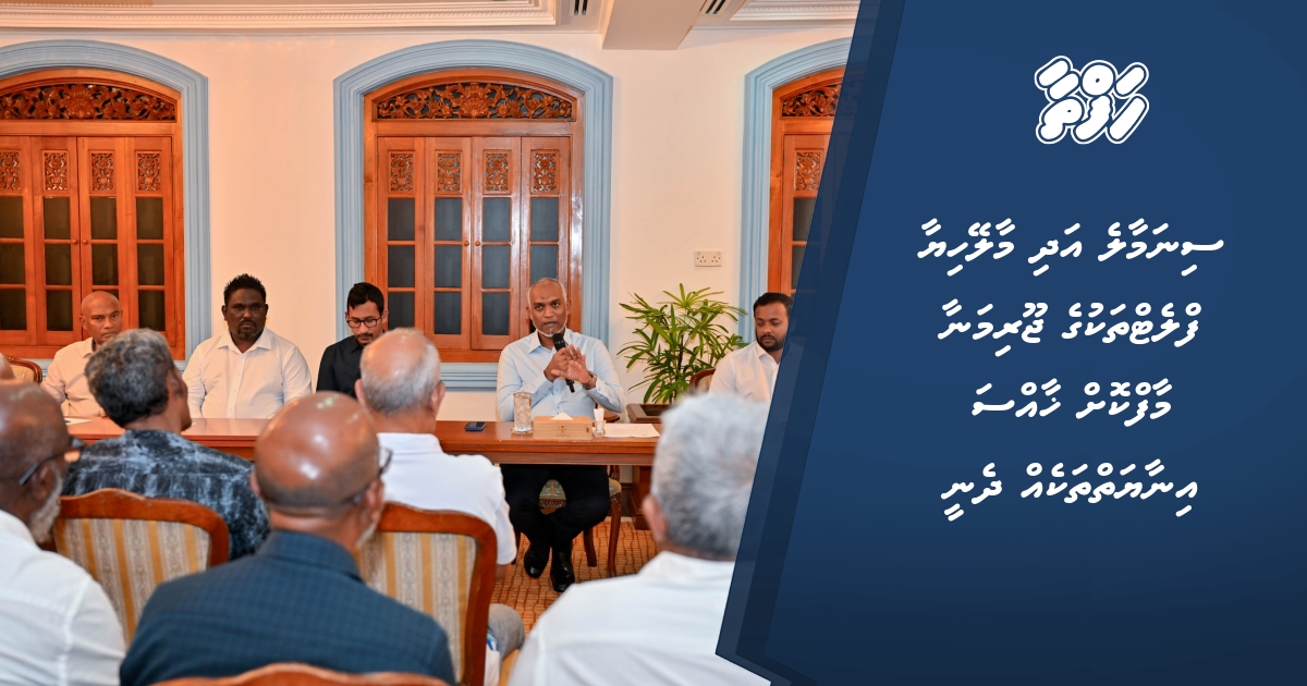 ރައީސުލްޖުމްހޫރިއްޔާ ޑރ. މުޙައްމަދު މުޢިއްޒު، ސިނަމާލެ އަދި މާލޭހިޔާގެ ފްލެޓްތަކުގައި ދިރިއުޅޭ ބައެއް ފަރާތްތަކާ ބައްދަލުކުރައްވައި، އެފަރާތްތަކުގެ ކަންބޮޑުވުންތަކަށް ހައްލު ހޯއްދަވައިދެއްވުމުގެ ގޮތުން ޚާއްޞަ އިނާޔަތެއް ހަމަޖައްސަވައިދެއްވުމަށް ނިންމަވާފައިވާކަން ވަނީ ހާމަކުރައްވާފައެވެ. މި ބައްދަލުކުރެއްވުން އޮތީ ރައީސުލްޖުމްހޫރިއްޔާގެ ރަސްމީ ގެކޮޅު، މުލިއާގޭގައި އިއްޔެ ހަވީރުއެވެ.
