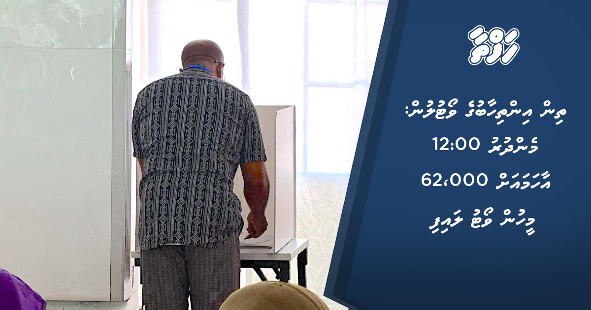 މިއަދު ކުރިއަށް ދަމުންދާ ލޯކަލް ކައުންސިލު އިންތިހާބާއި އަންހެނުންގެ ތަރައްގީއަށް މަސައްކަތްކުރާ ކޮމެޓީގެ އިންތިހާބު އަދި ރިޔާސީ އިންތިހާބާއި މަޖިލިސް އިންތިހާބު އެއް ދުވަހެއްގައި ބޭއްވުމާ ގުޅޭ ގޮތުން އަހާ ފެންނަ ނުފެންނަ ވޯޓުގައި މިހާތަނަށް 62،000 މީހުން ވޯޓުލާފައިވާ ކަމަށް އިލެކްޝަންސް ކޮމިޝަން (އީސީ) އިން ބުނެފި އެވެ.