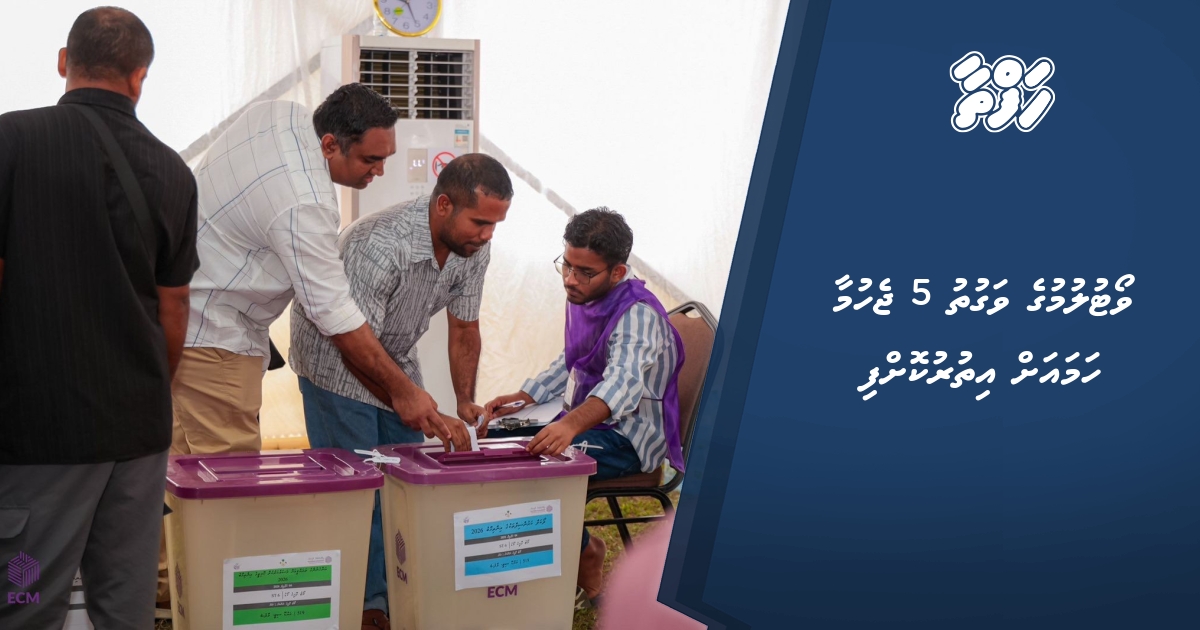 މިއަދު ކުރިއަށްދާ ލޯކަލް ކައުންސިލްތަކާއި އަންހެނުންގެ ތަރައްޤީއަށް މަސައްކަތްކުރާ ކޮމިޓީގެ އިންތިޚާބު އަދި ރައްޔިތުންގެ ޚިޔާލު ހޯދުމުގެ ޢާންމު ވޯޓުލުމުގެ ވަގުތު ހަވީރު 5 ޖެހުމާ ހަމައަށް އިތުރުކޮށްފިއެވެ.