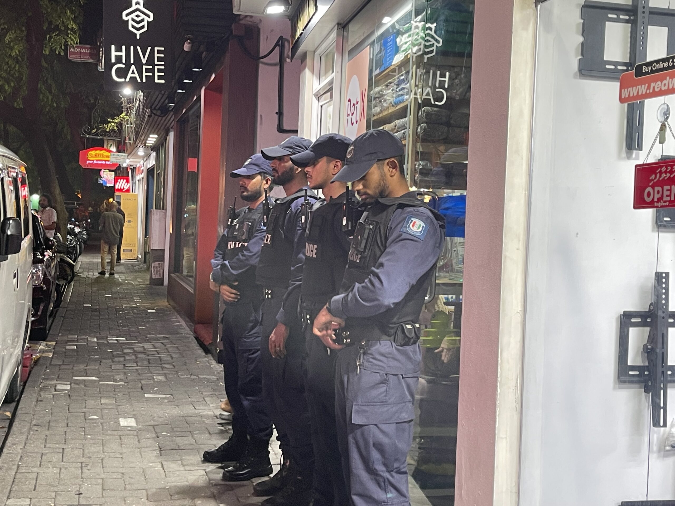 ބައެއް ފުލުހުން އަދަދު ނޫހުގެ އޮފީހުގެ ތެރޭގައި ބަލައި ފާސްކުރުމުގެ މަސައްކަތްކުރަމުންދާ އިރު، އެތެރެއަށް ބަޔަކަށް ނުވަދެވޭ ގޮތަށް ބައެއް ފުލުހުން ތިބީ ބޭރުގައެވެ.
